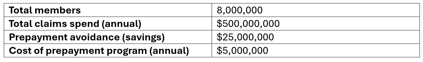 • Prepay ROI = total claims spend × prepayment avoidance (savings) rate) − cost of prepayment program